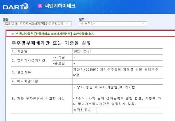 제24기 주주명부폐쇄기간 또는 기준일 설정 페이지 정보 작성자 최고관리자 작성일25-12-16 15:49 조회17회 댓글0건 관련링크 본문 https://dart.fss.or.kr/dsaf001/main.do?rcpNo=20251216901057 다음글 목록